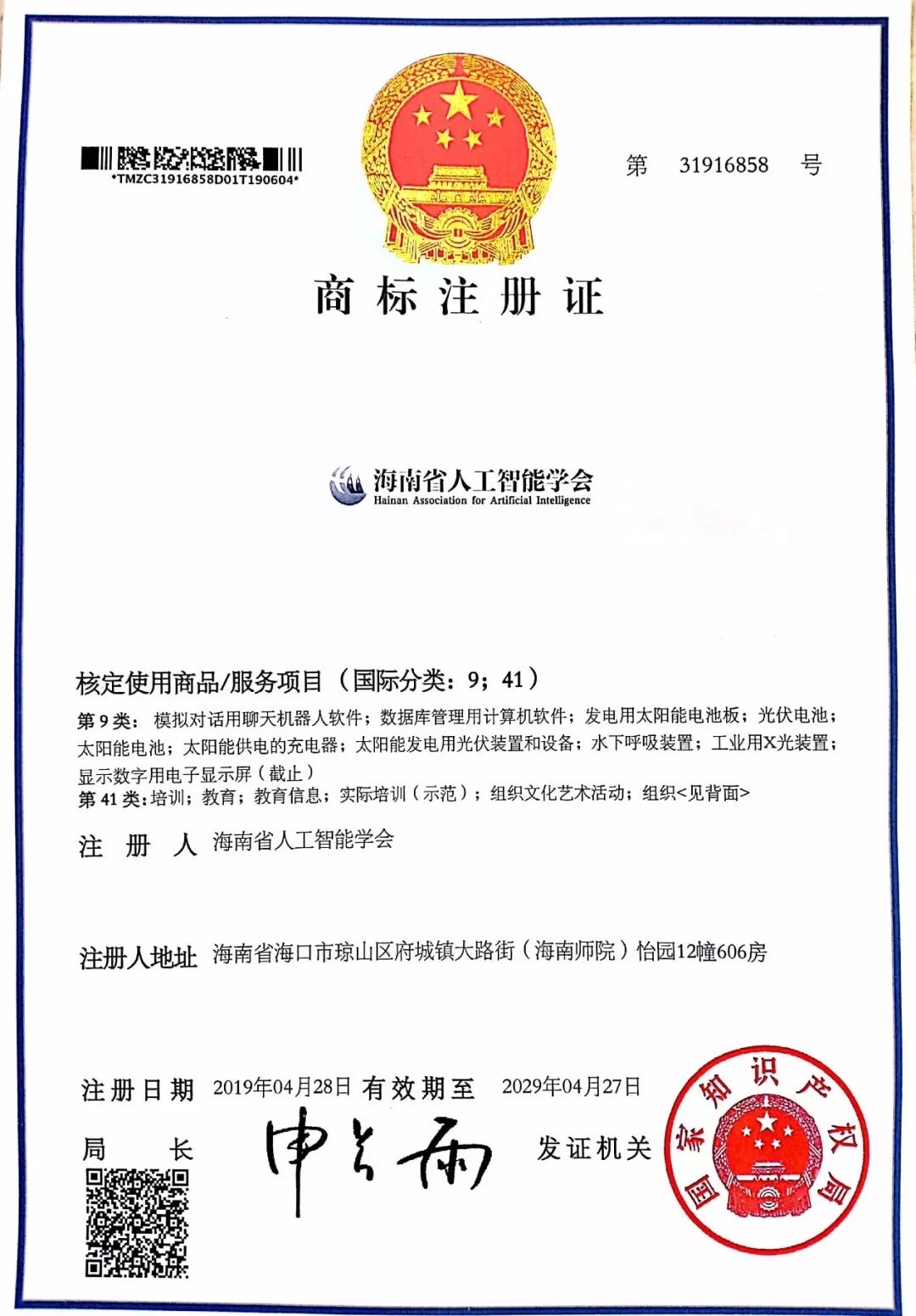 我会申请的“海南省人工智能学会”商标的成功注册,不仅使该标志能够得到国家强制力的保护,而且对维护学会名称及扩大学会影响都将具有积极的意义。