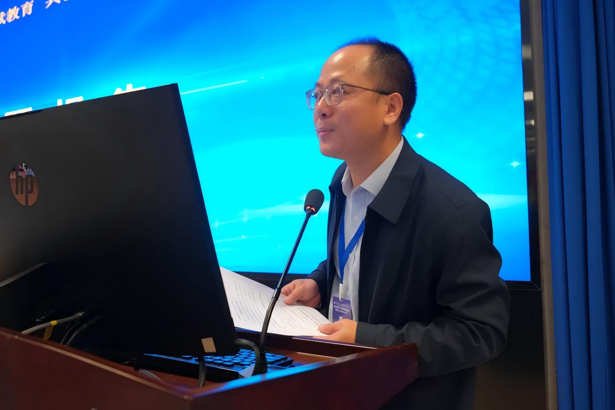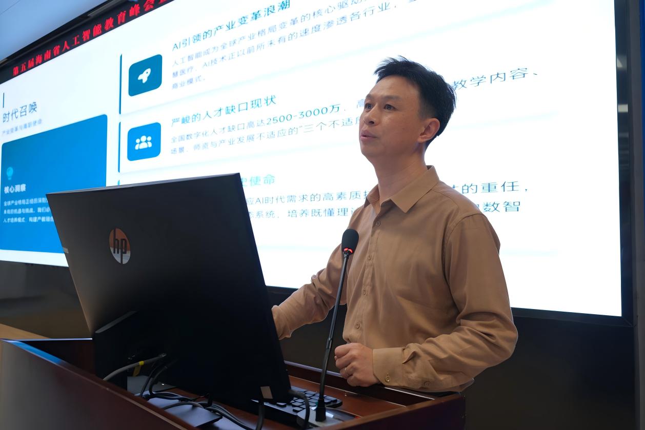 海南经贸职业技术学院王忠教授做题为“数据驱动·AI赋能·协同贯通:产教融合新生态的构建与创新”的主题报告,分享数据驱动下产教融合新生态的构建路径,介绍“四链融通”育人逻辑。